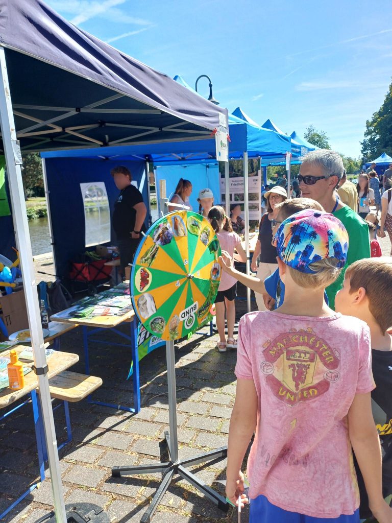Die BUND Kreisgruppe Mülheim war am vergangenen Wochenende mit einem eigenen Stand beim Familienfest am Haus Ruhrnatur vertreten. Viele Kinder besuchten neugierig den Stand und konnten am bunten Glücksrad ihr Wissen über heimische Tiere unter Beweis stellen. Wer drei Tiere richtig erriet, wurde mit einer liebevoll gestalteten Postkarte belohnt und konnte aktuelles Informationsmaterial zum Umweltschutz mitnehmen.